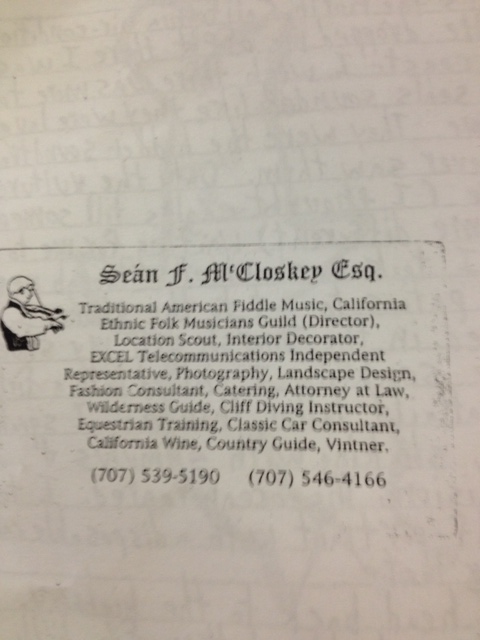 He didn’t have anything to do.  He said, fuck it, he’d take me on a tour of Sonoma County.  Blasting Mariachi music, divining the border between fog and quarry dust.  First stop Occidental.  We ate on a restaurant porch.  He brought out his violin from the car and fiddled me a song, well sung but many sour notes on his instrument.